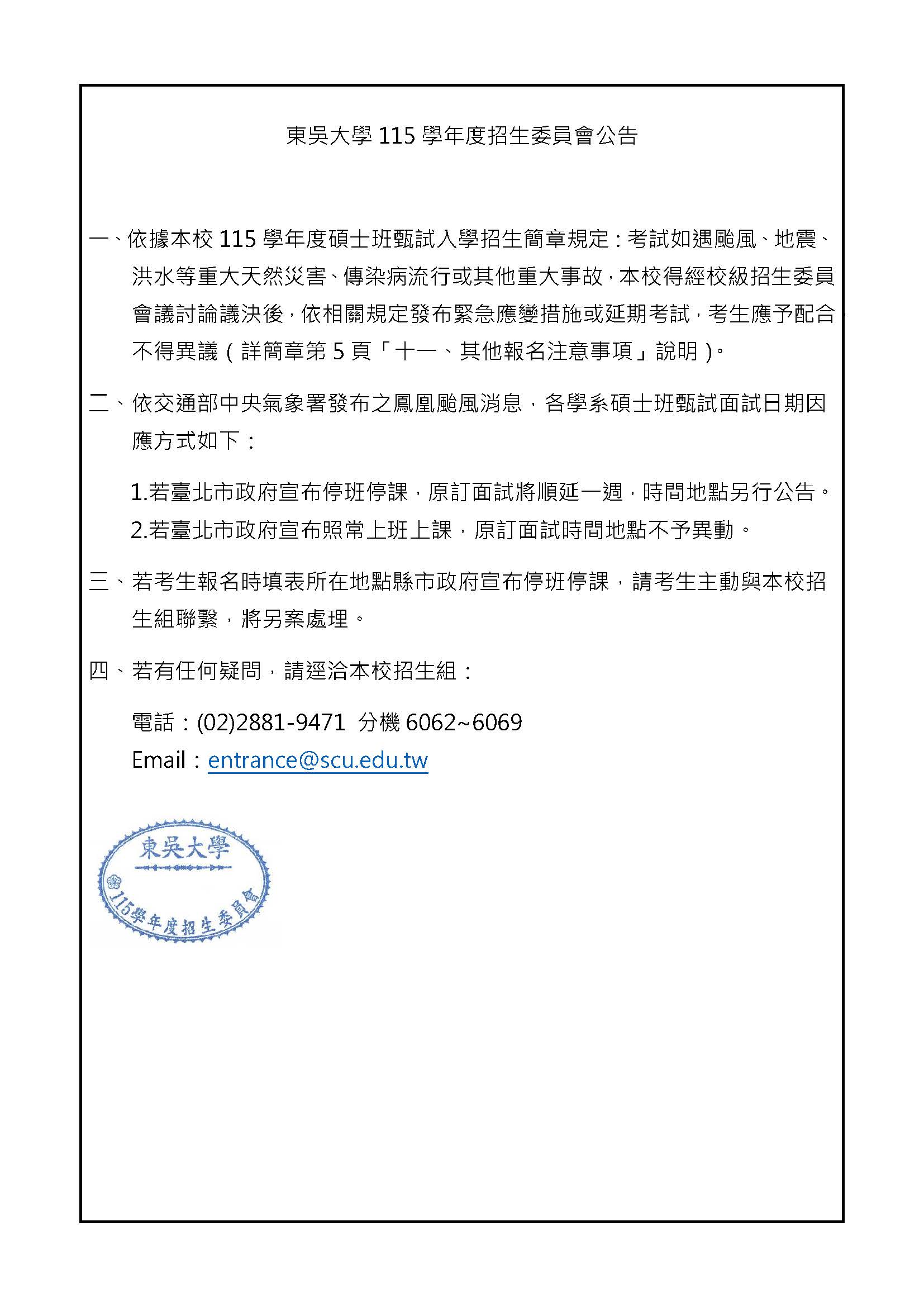 因應鳳凰颱風115學年度碩士班甄試各學系面試日期公告說明